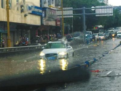 28日,南充顺庆区金鱼岭路积水20多厘米,有车辆被困水中。