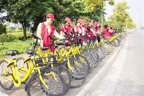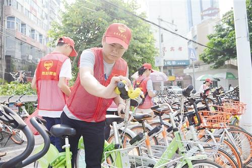 7月29日,青秀区组织20多名志愿者对园湖路、东葛路沿线的200多辆公共自行车和共享单车进行了整理和擦拭。