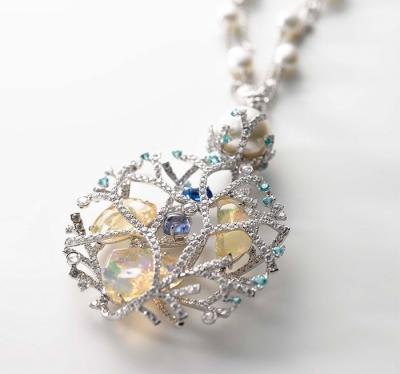 此外锦鳞流连于珊瑚丛中的场景也被带到珠宝中,通过白南洋珍珠、蛋白石、尖晶石、帕拉伊巴碧玺、钻石与白金等珠宝,演绎一出海洋梦境。