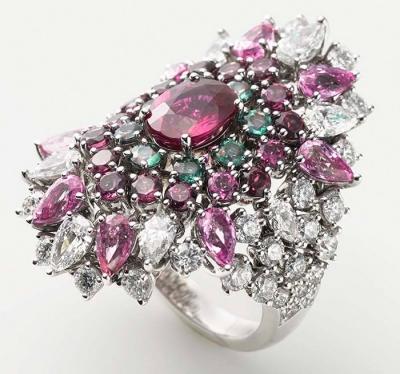 三、热情似火、耀眼夺目的红宝石是这款戒指当之无愧的主角。设计师模拟喷薄而出的“岩浆”,藉由绚丽多彩的手笔,展现了充满未知的自然界的神秘莫测。整款戒指散发着独特的现代审美意趣。