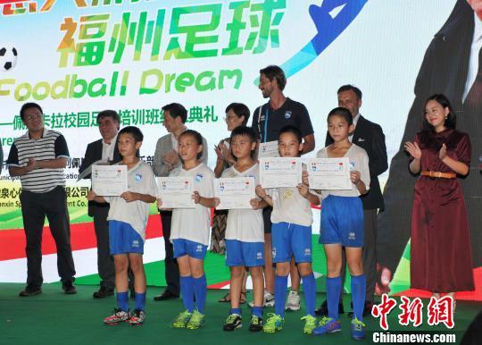 8月3日晚,福州-佩斯卡拉校园足球培训班正式结业,福州市融侨小学(左)与意大利佩斯卡拉俱乐部足球学校结为友好学校。 张斌 摄