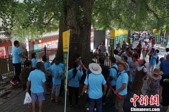 导游为游客讲解少林寺内最古老的一棵银杏树,已经有1500多岁了,与少林寺同龄。 韩章云 摄