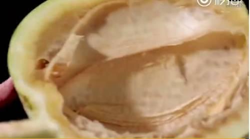 从视频截图看,西瓜皮比较厚,不好切,说明瓜皮致密且里面的纤维比较丰富,这使西瓜能保持形状,不会像橙子那样表面皱缩。