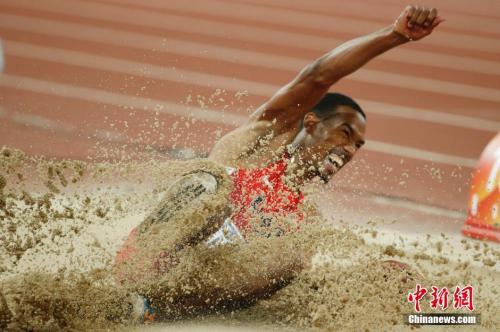 资料图:2015年国际田联田径世界锦标赛男子三级跳远决赛,美国选手泰勒以18米21的成绩夺得冠军。中新社发 盛佳鹏 摄