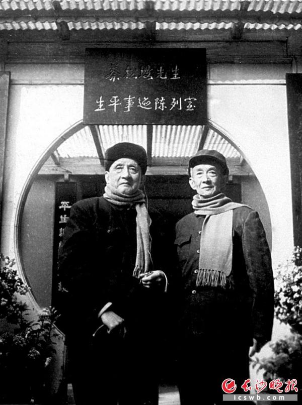 1959年,第三届全国政协会议后,刘公武先生(左)和蔡锷的儿子一起参观蔡锷纪念馆。