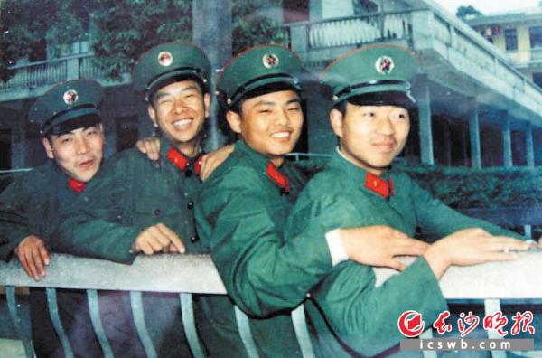 第一次穿军装。1987年3月,新兵训练结束后,部队为我们配发了有帽徽和领章的军装,这意味着成为了一名真正的军人,兴奋的我(右一)和班上的另外3名宁乡兵来了一张军装照。