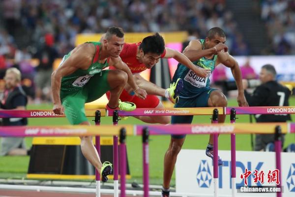 8月6日,谢文骏(左二)在比赛中。当日,在伦敦举行的2017年国际田联世界田径锦标赛男子110米栏半决赛中,谢文骏名列半决赛总成绩第12名,无缘决赛。中新社记者 韩海丹 摄