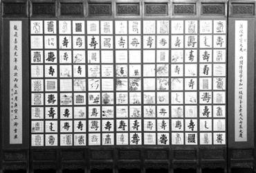 寿字的汉文字体有钟鼎文、蝌蚪文、篆文及楷、草、隶等各种书法。其中第66幅是官至江南道监察御使的徐烺 的篆体“寿”字,与众不同的是,这个寿字是由259个蝇头小楷的寿字组成的。