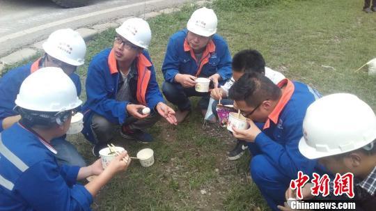 中国铁建二十五局集团的救援人员就地用餐。 程利军 摄