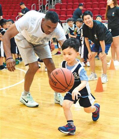 美国NBA球星阿伦·休斯顿(左)指导中国香港小学员运球。