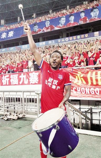 ?赛后,费尔南多打鼓和球迷们一起庆祝胜利。 本报记者 高科 摄
