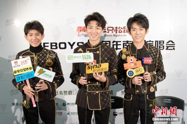 8月11日晚,TFBOYS组合在江苏南京奥体中心体育馆举行四周年演唱会。组合成员王俊凯、王源、易烊千玺受访时表示11日和13日晚上的演唱会除了会在歌曲顺序方面做一些调整,三位成员还会带来与众不同的个人秀部分。 中新社记者 刘文彬 摄