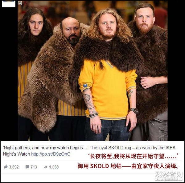 随着最新一季《权力的游戏》热播,米歇尔的这番话再次被媒体翻出,在社交媒体上被热议。据鼓网(The Drum)报道,许多人纷纷跑去宜家的地毯区,cos起了守夜人。