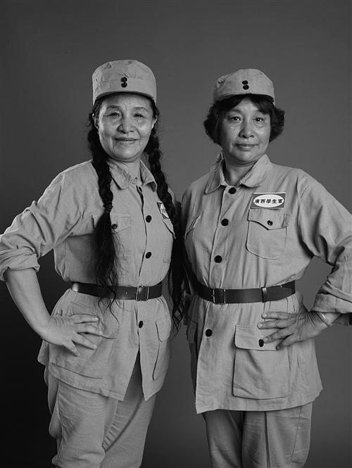 62岁的潘晓春梳起久违的麻花辫,与妹妹潘迎一起换上胸前印有“广西学生军”字样的服装,她们双手叉腰,挺直腰杆,一脸自豪。