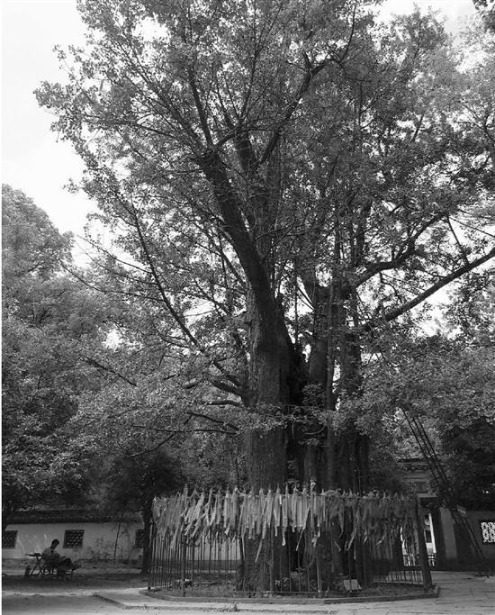 记者专程去西湖边的五云山,去看山顶那棵杭州最古老的树,1400多年的银杏。爬上山,在山顶一眼望过去,就是那棵古老的银杏,四周围栏上系满了红色的祈福飘带。20多米高的树干和巨大的树冠让树荫下乘凉的人显得很小。树后面就是真际寺,里面小卖部的老板说,天天都有人跑来看这棵树,再等几个月,秋天银杏叶黄的时候,别提多好看了。