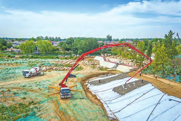 工人们正在浇筑湖岸护坡。