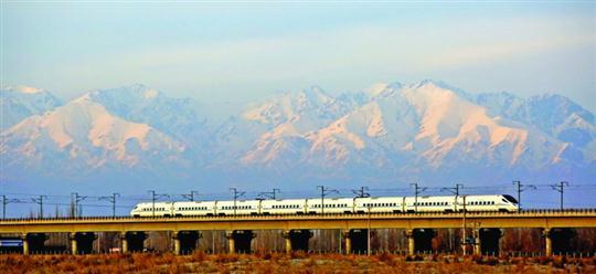 图为兰新高铁动车组列车在天山脚下行驶(资料照片)。 □新华社发