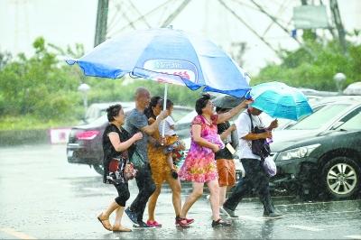 市民撑伞走在瓢泼大雨中 记者任勇 摄