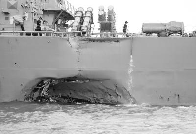 左图:这是8月21日在新加坡海域拍摄的发生碰撞事故的美国海军“约翰·S·麦凯恩”号导弹驱逐舰