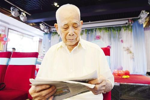 爱看报,从中获取新知识,是潘新政最大的爱好。尤为难得的是,这位百岁老人在看报时不用戴眼镜,也能看清楚报纸上的内容。