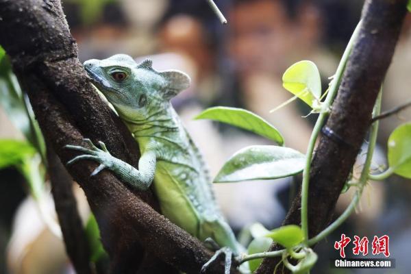 8月24日,蜥蜴、蛇、蜘蛛、土拨鼠等新派爬宠齐聚上海宠物展,吸引时尚男女前来观赏。据了解,爬虫类近年正逐渐取代传统意义上的宠物,成为年轻人彰显个性的新宠。图为树枝上的一只蜥蜴。 中新社记者 张亨伟 摄