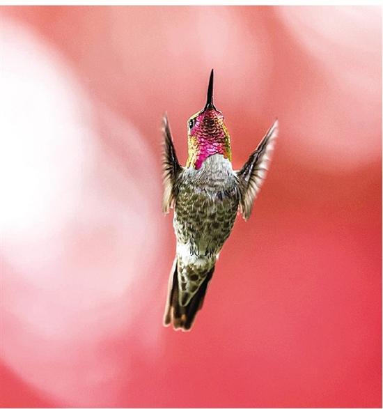 一个偶然的机会,周宁迷上了拍蜂鸟,刚开始他以为蜂鸟很难拍,不知其所,飞得又快。“有阵子散步,我发现一只非常漂亮的蜂鸟总是呆在同一棵树枝上,连续好多天。后来才知道蜂鸟是一种独居、霸占性很强的鸟,总是呆在自己的领地附近,所以当发现一只蜂鸟后,就可以天天去同一个地方拍它。我太太喜欢养花,后来我家的后院也来了蜂鸟,蜂鸟是名副其实的采花大盗,经常不知疲倦地在花丛中换着各种姿势吸花蜜,一呆就是几个月。”周宁说。周宁拍到最多的是安氏蜂鸟(Anna’s Hummingbird),体长一般只有12厘米,体背鳞状羽,大都闪耀彩虹色,雄鸟更鲜艳。“蜂鸟妈妈很辛苦,独自筑巢,独自养娃,且每10分钟就要喂一次小鸟。”为了拍到一组喂鸟照片,周宁用了三周时间,每天花2到3小时,仔细观察和捕捉它们的行为,才记录下这难得的瞬间。