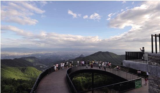 市民在金华山莲花观景台登高远眺观赏金华城市美景