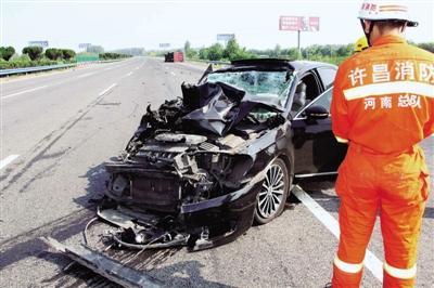 本报讯 昨日,京港澳高速长葛段发生两车追尾事故,一辆大众轿车撞击使得前方货车发生侧翻,轿车司机被困驾驶室。
