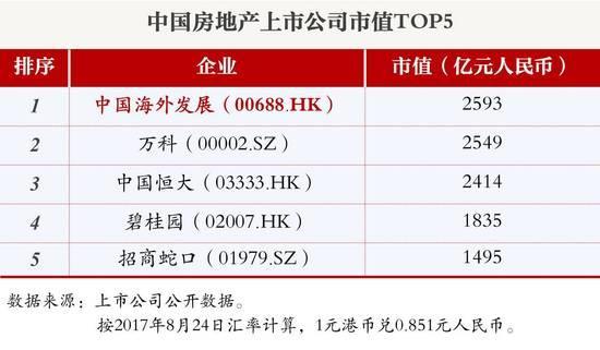 2017年8月21日,中国建筑旗下中海地产(中国海外发展00688.HK)发布2017上半年业绩,其后,中海地产股价连涨三天,股价累计上涨超过12%,三天市值累计上涨328.7亿港元,总市值历史性地突破3000亿港元。以8月24日收盘价27.8港元计算,中海地产市值达3046亿港元(约2593亿元人民币,按2017年8月24日汇率计算,1元港币兑0.851元人民币),跃居行业第一。