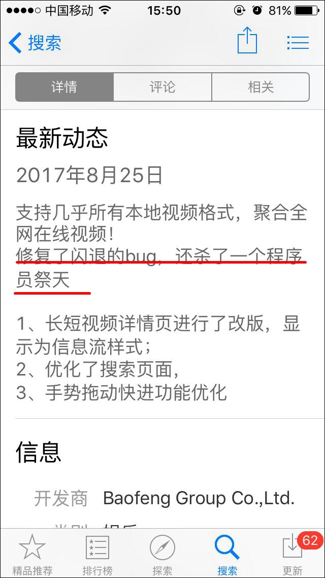 2017年8月25日,暴风影音在苹果APP应用商店中推出最新版本,结果,程序详情的最新动态中的一句话让网友们“炸了”!只见介绍里赫然出现一行:“修复了闪退的bug,还杀了一个程序员祭天”。