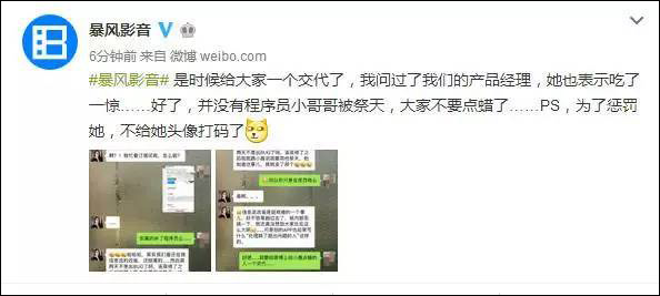 对此,暴风影音官方微博于25日晚间6点23分做出回应,称“是时候给大家一个交代了,我问过了我们的产品经理,她也表示吃了一惊……好了,并没有程序员小哥哥被祭天,大家不要点蜡了……PS,为了惩罚她,不给她头像打码了”。微博附上的与产品经理的聊天记录显示,其称“就内部恶搞一下,我还真没想到大家反应这么大啊”。