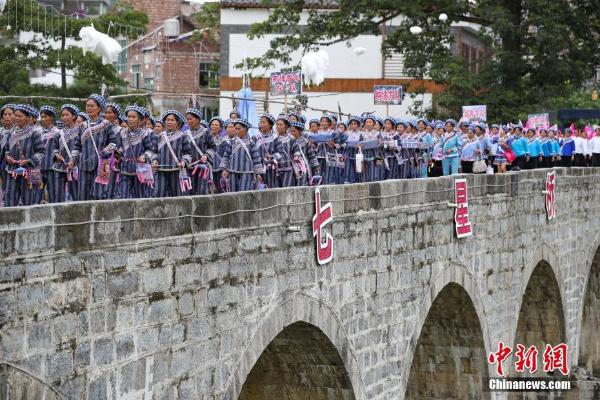 8月26日,2017国际山地旅游暨户外运动大会系列活动——贵州省望谟县桑郎“七星浪哨·相约桑郎”布依情人节活动开幕。桑郎镇布依族民众身着盛装,载歌载舞,通过刺绣蜡染布艺展示、特色布依美食展示、山歌对唱、七星桥上浪哨等活动,向游客展示其独特的民族文化及风俗。“浪哨”为布依语,是布依青年男女到了谈婚论嫁的年龄,约会以“对歌”的方式选择意中人。贺俊怡 摄