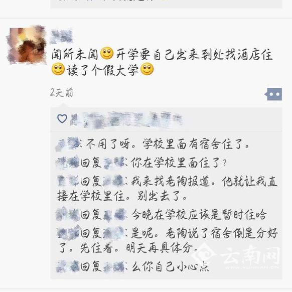 近日,有网友向云南网,爆料,云南开放大学成教学院的一些学生开学后没有宿舍住。网友附图中一张QQ群聊天记录显示,疑似一位教师在群里发出通知,其专业还有27个女生没有宿舍,在昆明有亲戚的同学就住亲戚家,如果家在曲靖、安宁这些地方的同学,可先回家两天,离家远的学生就和分到宿舍的学生“挤一挤”。