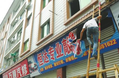 彭泽兰接到行政处罚告知书后,立即准备暂时摘下自家店招,“认罚呗,按要求整改好了才能再开门。”说完,他把一架长梯搭在汽修店门面前,叫两位朋友扶稳梯子后,敏捷地攀上长梯。只听“哗啦”一声,钉在门面上的店招被他一把扯下。
