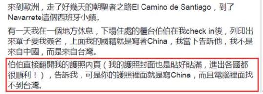 该“台独”博主称,自己走了好多天想到西班牙小镇度假,但到酒店前台登记的时候,看到单子上标注他的国籍为China,就和前台大叔理论,想要改成Taiwan。