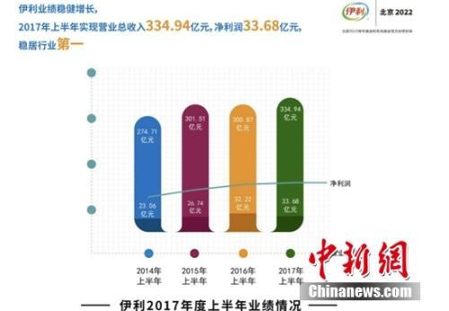 中新网8月31日电 近期,各大乳企相继发布2017上半年业绩报告。8月30日晚间,伊利发布了2017年上半年财务报告。据其财报显示,2017年上半年,伊利实现营业总收入334.94亿元,同比增长11.32%;净利润33.68亿元,同比增长4.52%。与业绩的持续增长相对应的是,伊利的净资产收益率连续几年保持在20%以上,位居全球乳业第一。