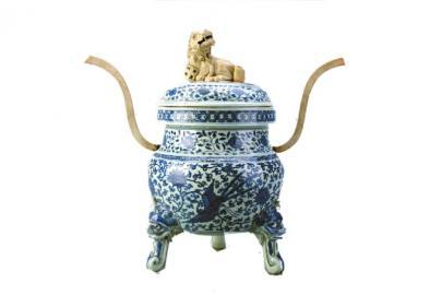 明嘉靖青花莲鹤纹素狮纽瓷熏炉。