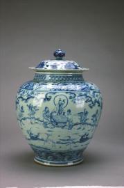 明景泰青花人物故事纹瓷盖罐。