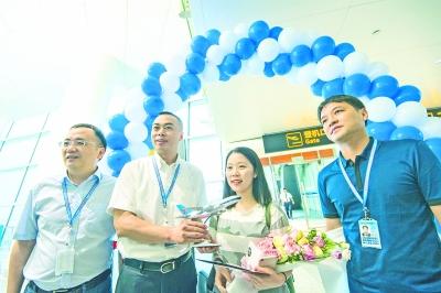昨天早上6:20,最早降落T3航站楼的是南航CZ645航班,第一个走出机舱的是广东籍大学生谭思琪。为了迎接这名客人,南航专门在到达口设置了彩虹门。这名女生获赠南航的一架飞机模型。