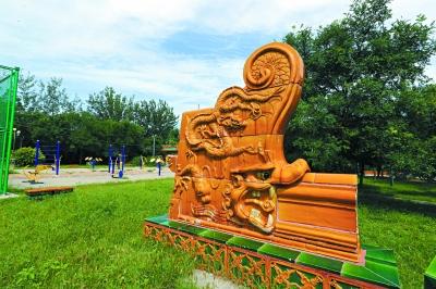 6000平方米的休闲广场上陈列着琉璃作品。这与修复天安门城楼所用正吻是一样的。