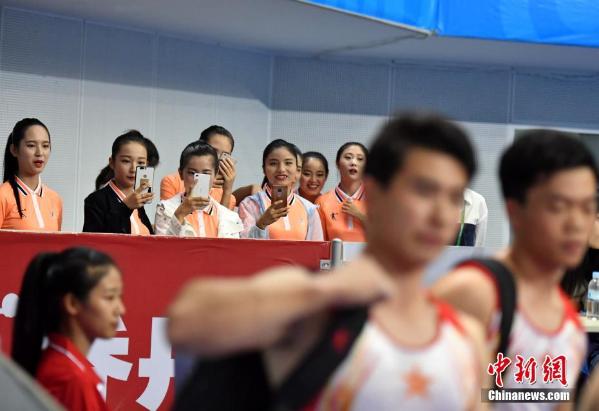 9月2日晚,天津全运会体操男子团体决赛现场,经过激烈角逐,贵州队夺得冠军,江苏队与广东队分获二、三名。图为女性志愿者被体操运动员吸引。 中新社记者 翟羽佳 摄
