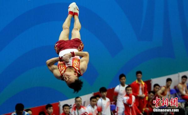 9月2日晚,第十三届全国运动会体操比赛男子团体决赛在天津市海河教育园体育中心体育馆战罢,经过六轮鏖战,贵州队力克群雄,以336.834分夺冠,江苏队列次席,季军由广东队获得。图为选手在跳马项目比赛中。 中新社记者 张道正 摄