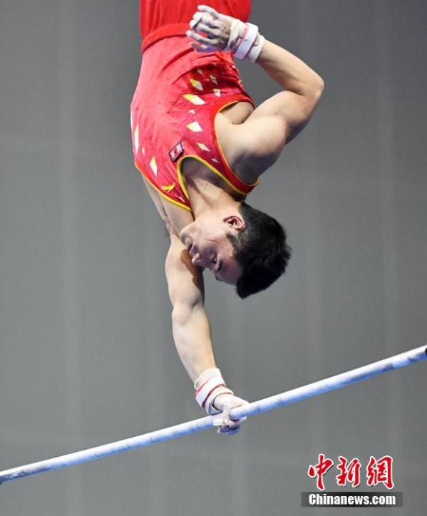 9月2日晚,天津全运会体操男子团体决赛现场,经过激烈角逐,贵州队夺得冠军,江苏队与广东队分获二、三名。图为运动员正在进行单杠项目比赛。 中新社记者 翟羽佳 摄