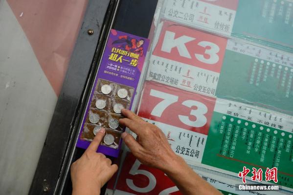 9月4日,民众研究共享公交硬币。当日,呼和浩特近300个公交站点出现共享公交硬币,该共享硬币一个站点共放置8枚1元硬币,写有“一次一枚,次日归还”的字样,供民众免费取用。 中新社记者 刘文华 摄