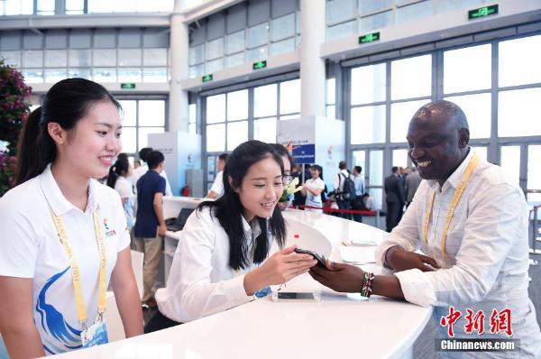 9月4日,位于厦门的金砖国家领导人第九次会晤新闻中心内,志愿者为外国记者提供咨询服务。 中新社记者 侯宇 摄