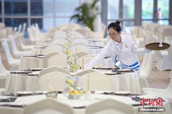 9月4日,位于厦门的金砖国家领导人第九次会晤新闻中心内,一名志愿者在媒体餐厅整理餐具。 中新社记者 侯宇 摄