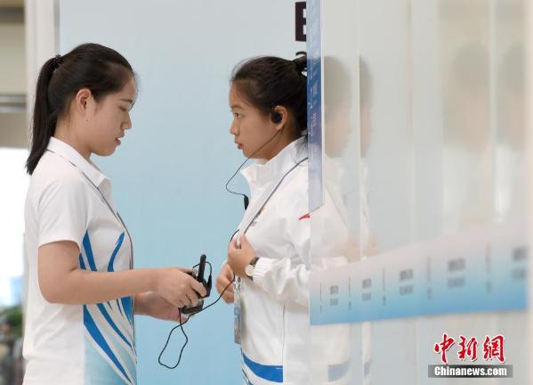 9月4日,位于厦门的金砖国家领导人第九次会晤新闻中心内,两名志愿者正在交接工作。 中新社记者 侯宇 摄