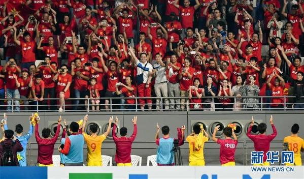 9月5日,中国队球员赛后向球迷致意。中国足球队5日在卡塔尔首都多哈以2:1战胜东道主卡塔尔队,取得了2018年世界杯亚洲区预选赛12强赛最后一场小组赛的胜利,但仍无缘俄罗斯世界杯。 新华社发(尼库摄)