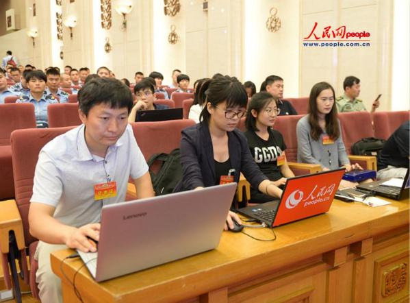 人民网记者在现场直播张锐先进事迹报告会。韩淑贤/摄