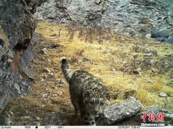 9月27日,青海省玉树藏族自治州杂多县政府和山水自然保护中心发布一批在澜沧江源头生物多样性监测中,由红外相机所捕捉到的雪豹、水鹿、赤狐、兔狲等多种野生动物照片。图为雪豹。 山水自然保护中心提供
